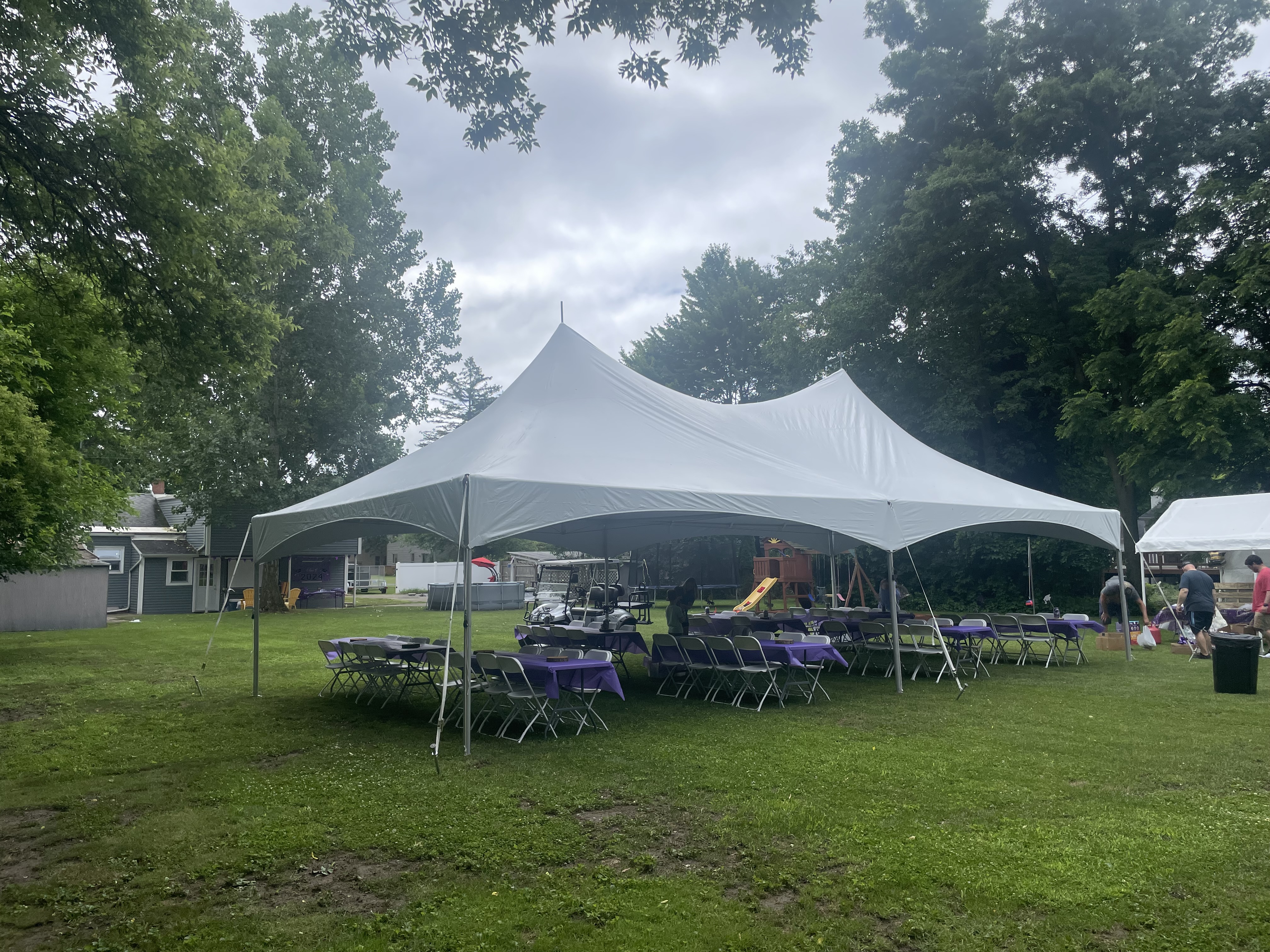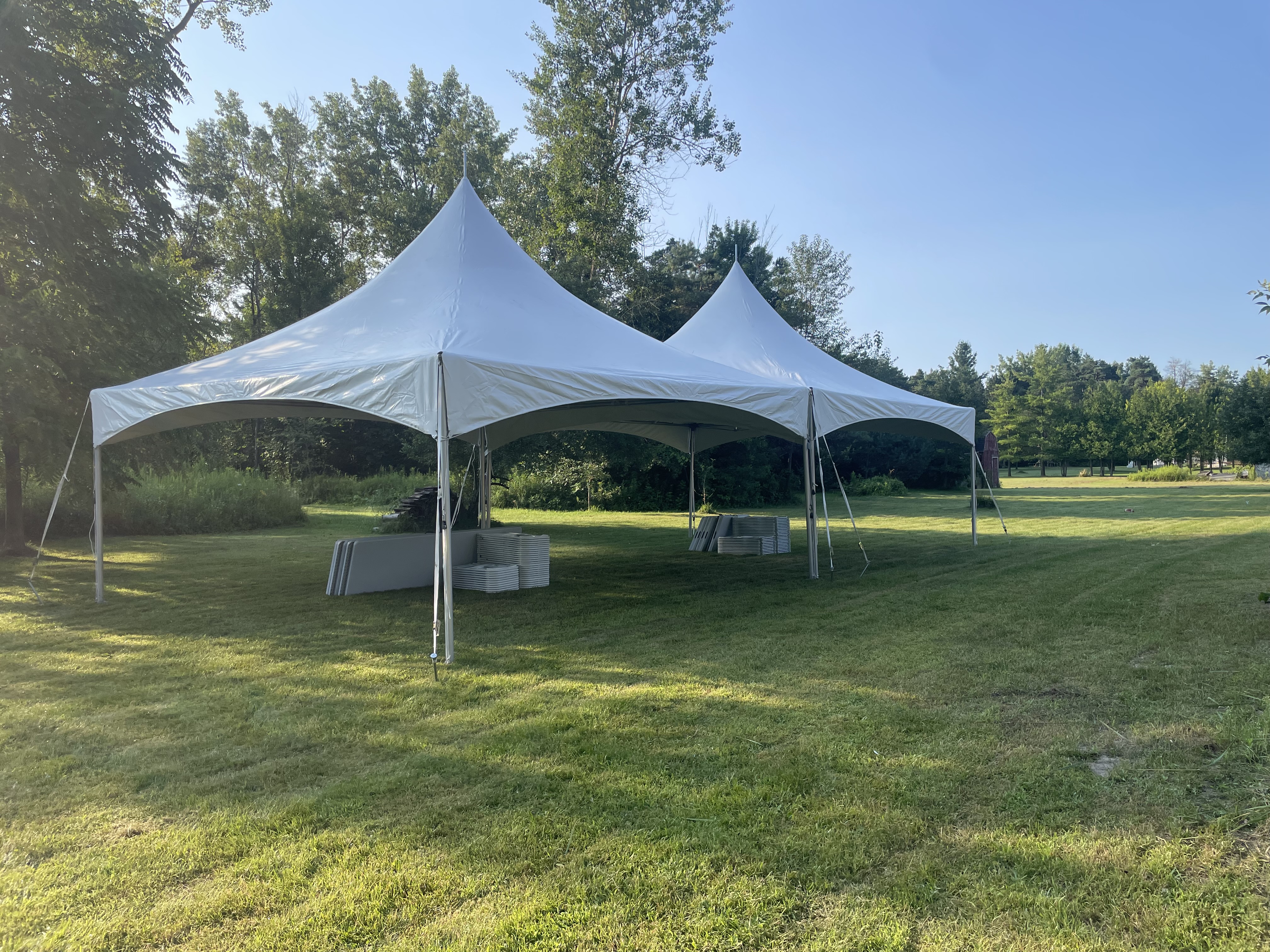 It includes a 20x40 High Peak Marquee Frame Tent, 10 8ft White tables, 80 White chairs, and a trash can!